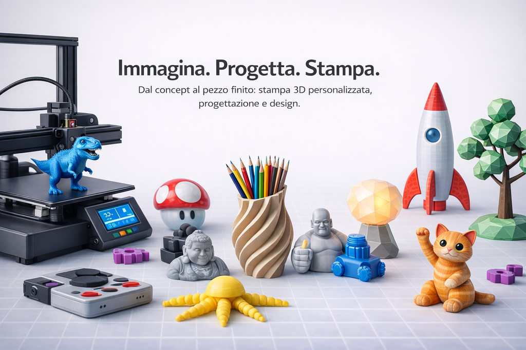 Realizziamo stampe 3D personalizzate con cura, precisione e materiali di qualità. Dai forma alle tue idee con soluzioni su misura per privati, creativi e piccole attività.